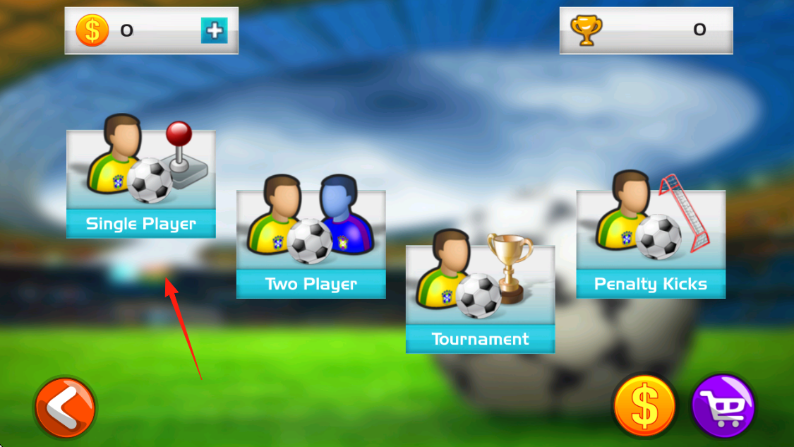 1、模式选择“SinglePlayer”单人赛、“TwoPlayer”双人对战、“Tournament”锦标赛、“PenaltyKicks”点球大战,按需选模式。
