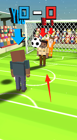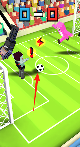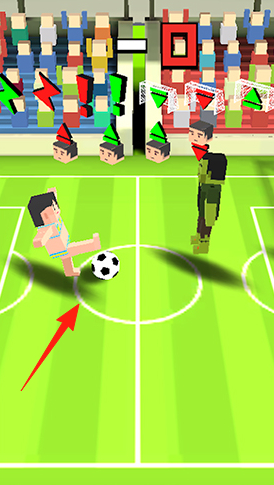 2、射门对抗突破防线后,瞄准球门,避开守门员(不同造型),将球射入,得分涨比分(0-0开局)。