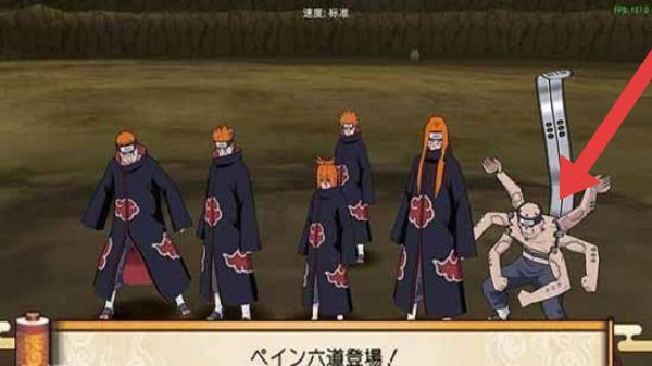 3、呈现“ペイン六道登場!”场景,图中角色是佩恩六道,属于火影忍者里晓组织的经典战斗设定,还原了动漫中佩恩六道的登场情节,能让玩家体验火影忍者相关战斗玩法。