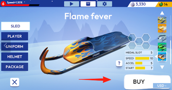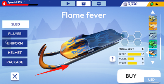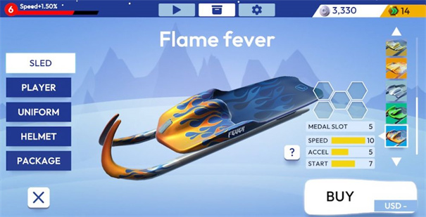1、装备定制选择“Flamefever”雪橇,查看属性(Speed速度、Accel加速),用金币钻石购买(“BUY”),还能定制角色(PLAYER)、外观(UNIFORM)。