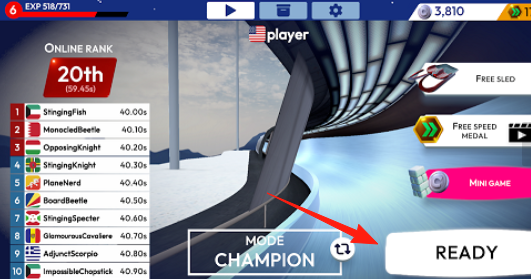 2、赛事准备“ONLINERANK”显示排名(20th),点“READY”匹配对手,参与锦标赛(MODECHAMPION),争取提升名次。
