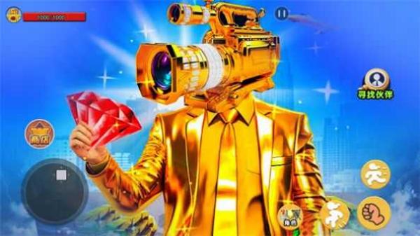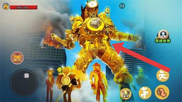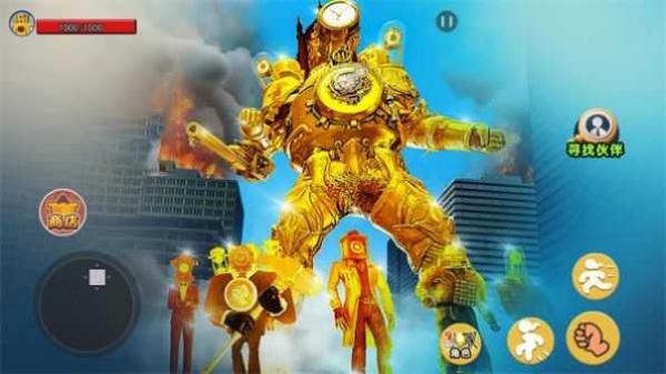 1、呈现出巨型金色机甲等火柴人角色,有“可攻伙伴”“商店”等界面元素,属于动作格斗类,玩家操控角色战斗、招募伙伴等。