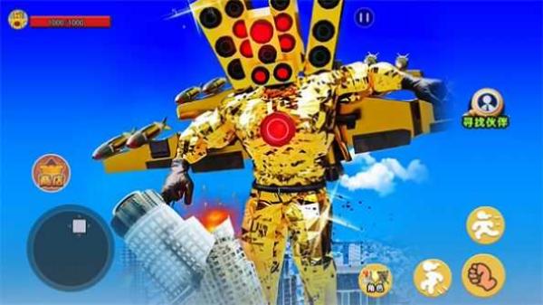 3、呈现金色机器人角色,有“寻找伙伴”等界面元素,属于动作格斗类,玩家操控机器人在城市场景战斗、互动,以机器人变形战斗等为特色。