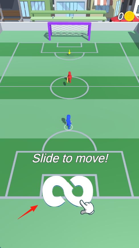 1、操作指引“Slidetomove!”提示滑动操作,控制蓝色角色,在足球场运球,瞄准红色守门员。