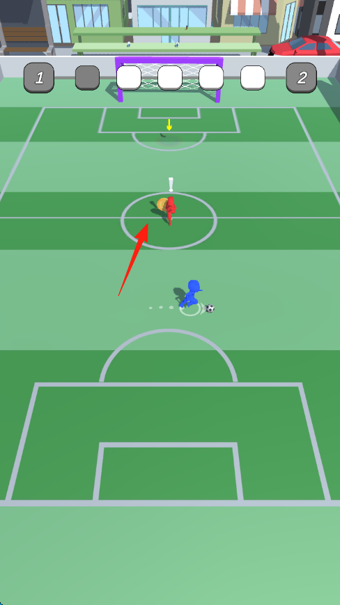 2、射门对抗调整角色位置,避开守门员(红),将球踢入紫色球门,上方显示“1、2”切换视角道具。