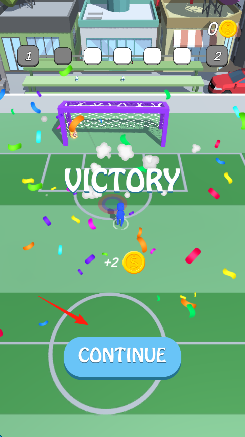 3、关卡结算进球后显示“VICTORY”,获金币奖励(+2),点“CONTINUE”进下一关,解锁新场景、角色。