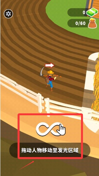 1、进入游戏后通过简单滑动屏幕的方式指引角色前进,角色接触作物区域后将自动执行收割动作,完成日常收获任务。