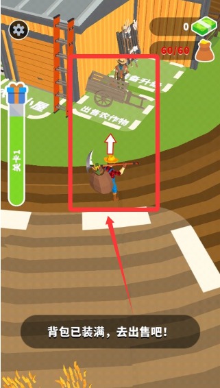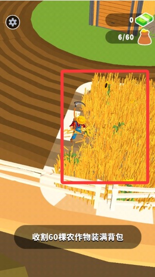 2、前往发光区域,角色会自动挥舞镰刀进行收割,根据指示收集农作物,装满背包。