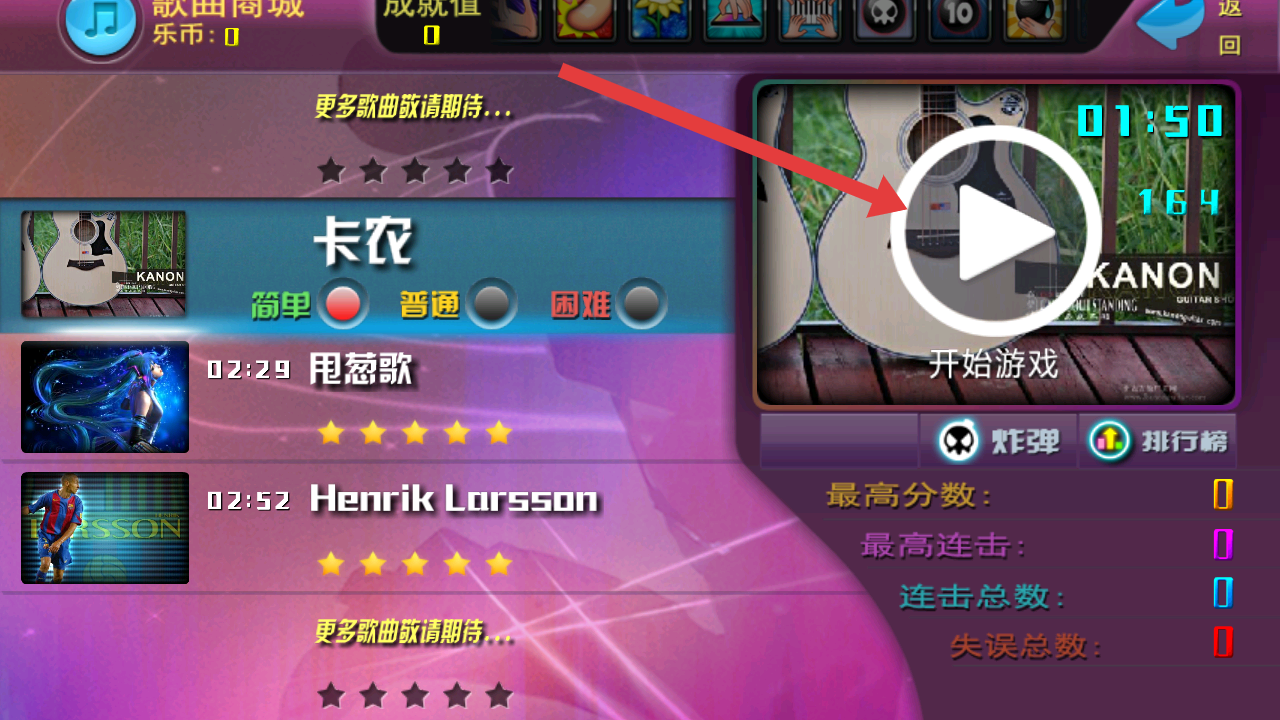 1、进入乐动舞指的游戏后,选曲在歌曲列表选卡农,择【简单】难度,点击右侧播放图标启动游戏。