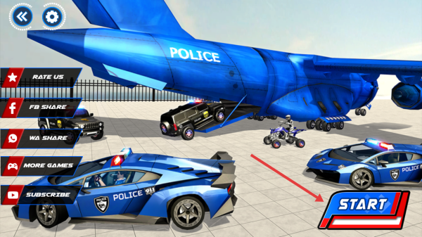 1、点击【START】选警用车辆(如跑车、越野车),进入运输/驾驶任务,在机场场景先熟悉车辆操控,按指引装/卸车,准备出发。