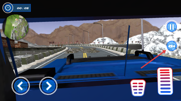 3、到山地等复杂路段,减速慢行,控方向避障碍(如落石),善用视角切换(相机按钮)观察路况,顺利抵达终点,解锁新任务、车辆。