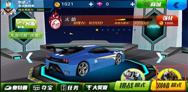 1、下载安装完成后进入游戏,点击屏幕右下方的开始按钮,选择剧情模式或挑战模式开启赛车之旅。