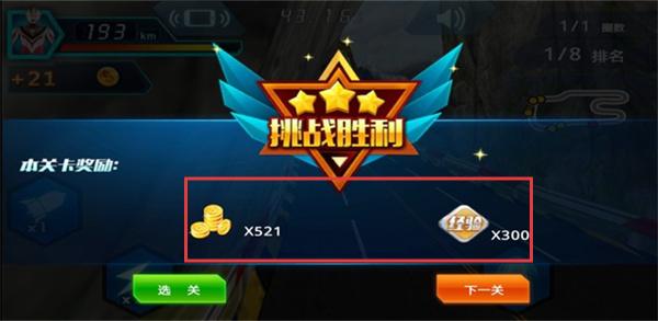 3、成功通关后获得金币经验奖励,可解锁更高级的奥特曼铠甲与赛车部件,挑战更高难度的赛道与对手。