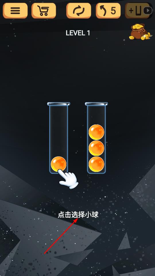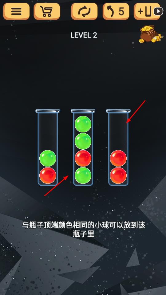 2、在关卡场景中,滑选择颜色相同的球,避开障碍物并收集道具,根据关卡目标完成相应任务。