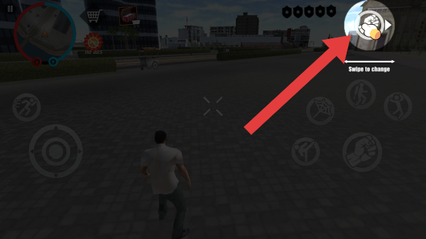 2、画面右侧有【Swipetochange】(滑动切换)提示,是切换角色状态、武器或技能的功能按钮,通常强调自由探索、战斗、驾驶等玩法,玩家可在城市场景中完成任务、互动。