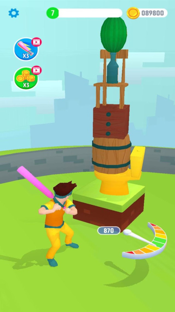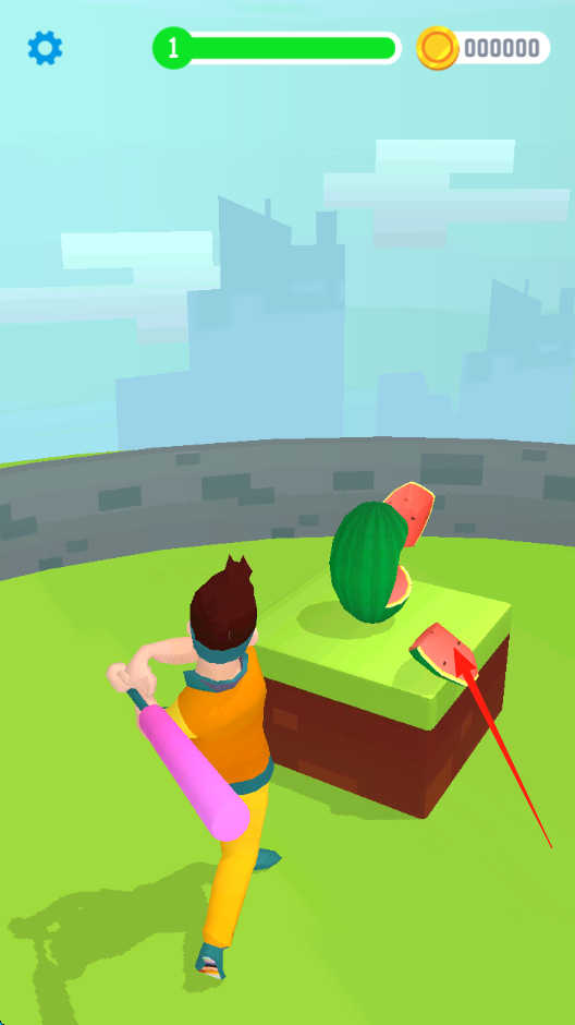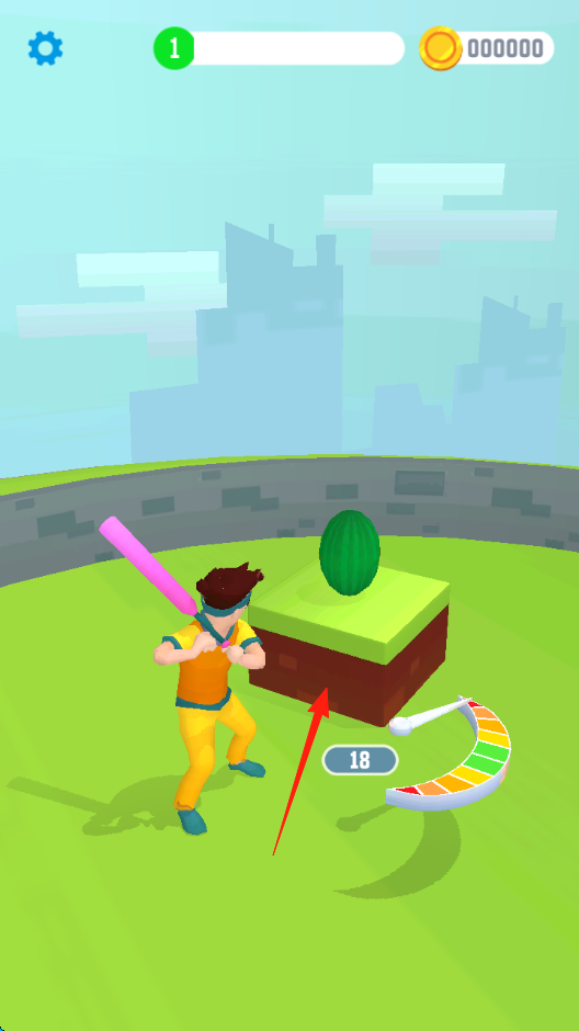 1、玩法机制控制黄衣角色,用粉色棒球棍,在圆形场地砍西瓜,通过蓄力条彩色弧形调整力度,击碎西瓜得分。