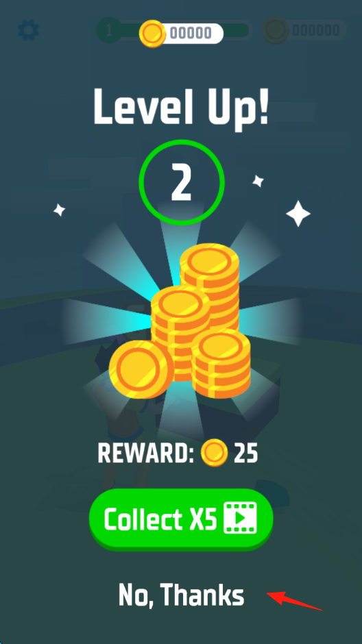 2、成长系统成功砍瓜后升级(LevelUp!到2级),获25金币奖励,可看广告(CollectX5)翻倍,或选“No,Thanks”跳过。