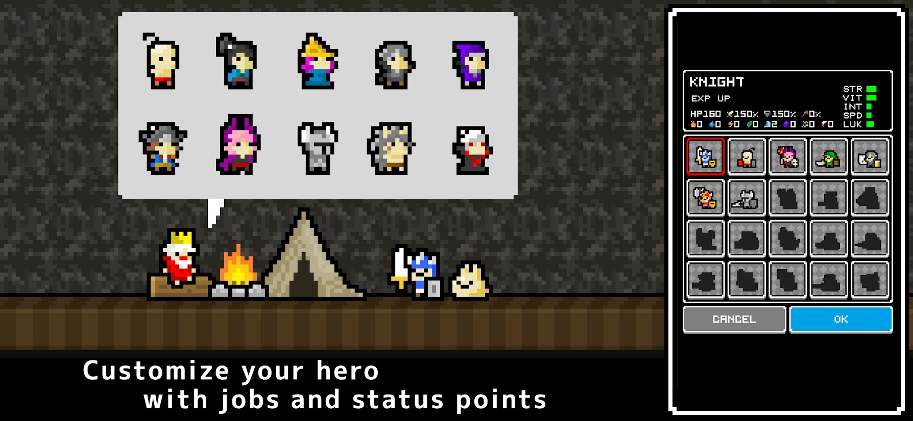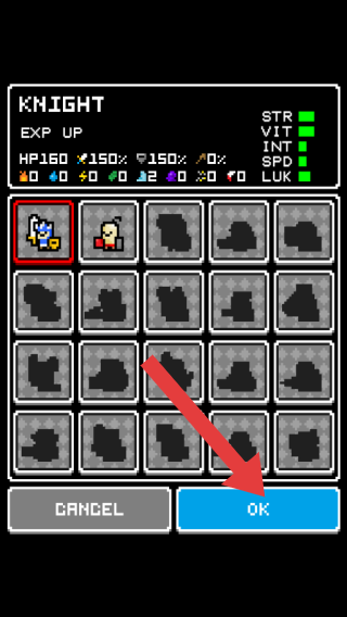 2、角色为“KNIGHT”,显示有经验提升、属性、血量及装备栏,下方有“CANCEL(取消)”和“OK(确认)”按钮,用于确认选择该骑士角色进入游戏。
