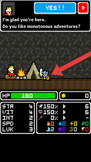 3、呈现开场互动场景,有角色、对话(即“很高兴你在这,你喜欢单调的冒险吗?”),还有骑士的属性面板,上方有“YES!!”按钮和关闭标识,属于典型的像素风冒险开局界面。