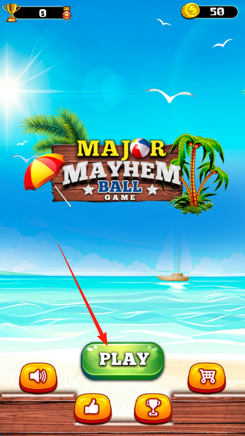 1、模式选择点击“PLAY”进入游戏,初始金币50,可通过商店(购物车)、点赞、奖杯功能,解锁道具、查看成就。