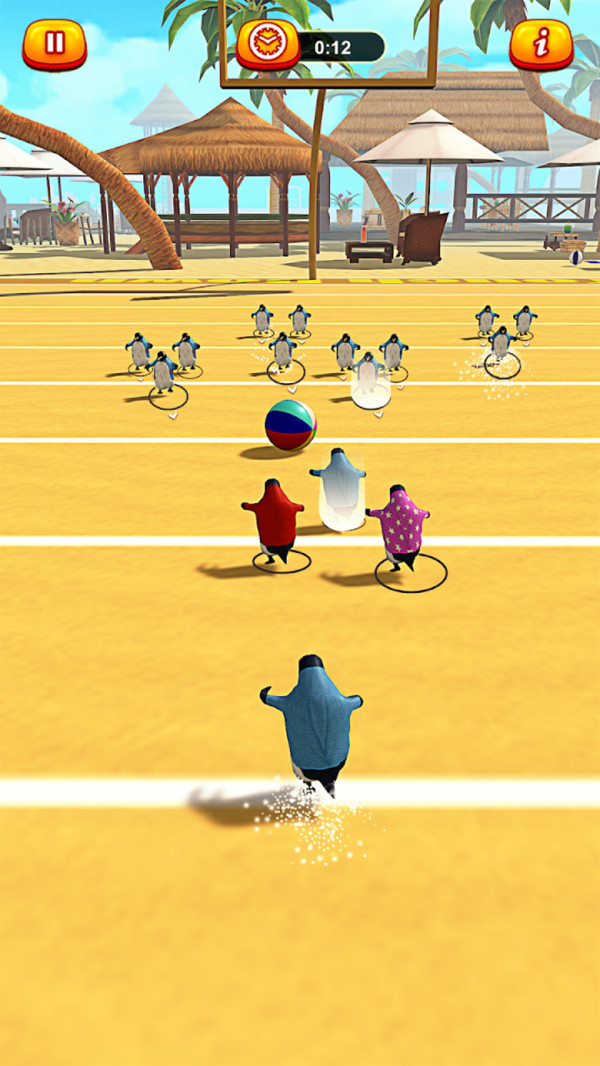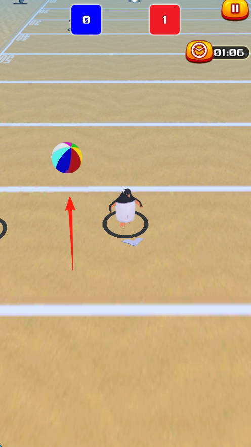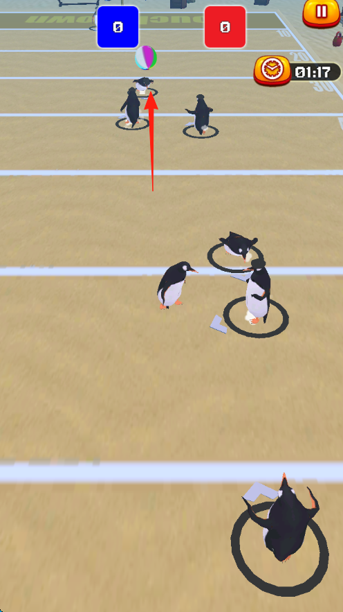 2、操作机制在沙滩球场,控制企鹅角色,点击滑动,击打彩球,争取投入对方篮筐(蓝、红框),限时1:17→1:06内得分。