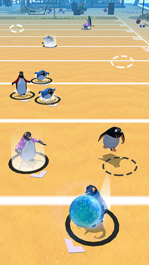 3、竞技目标通过精准击球,避开己方企鹅,让球落入对方区域,积累比分(蓝3→1),完成关卡,解锁新场景、角色皮肤。
