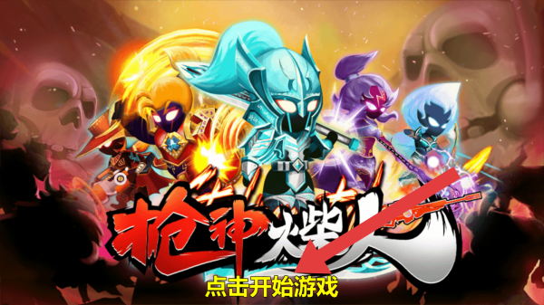 1、实体信息有名称“枪神火柴人”,以及【点击开始游戏】的操作提示,画面中展示了多个火柴人角色形象,属于动作射击类的开局画面。