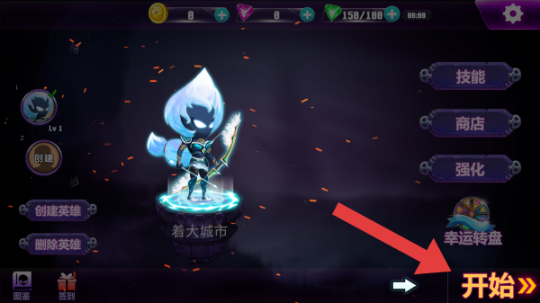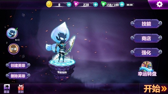 2、场景中的英雄角色,功能按钮如“技能”“商店”“强化”“幸运转盘”,还有“创建英雄”“删除英雄”“开始”等操作选项,以及金币、钻石、体力、时间等资源显示。