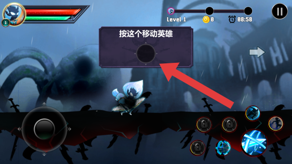 3、场景角色(火柴人英雄)、等级(Level1)、金币、时间,还有操作提示“按这个移动英雄”,以及技能按键、移动摇杆等界面元素。