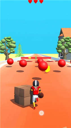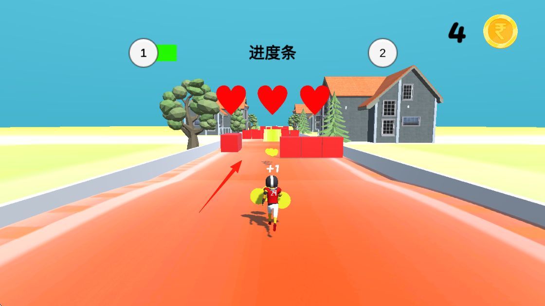 1、玩法机制控制角色(穿24号红队服),在道路上躲避障碍(红方块、黄圆柱),收集金币(₹标识),推进进度条(从1到2)。