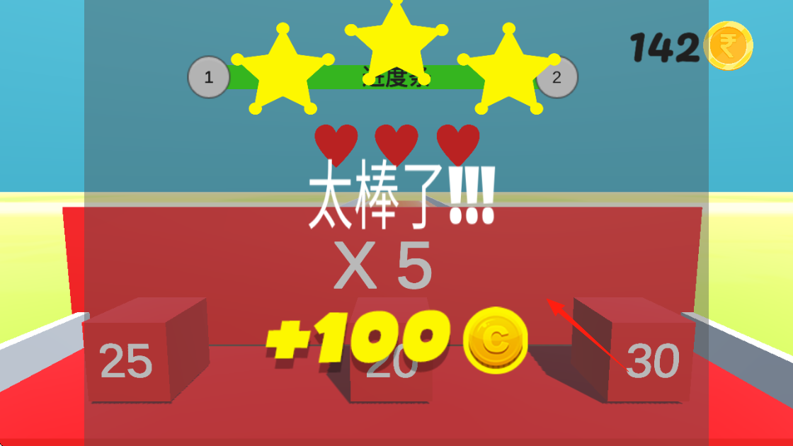 2、进度与奖励完成关卡(LEVEL未显示),进度条满后,获得“太棒了!!!×5”评价,+100金币,解锁新挑战(25、30标识)。