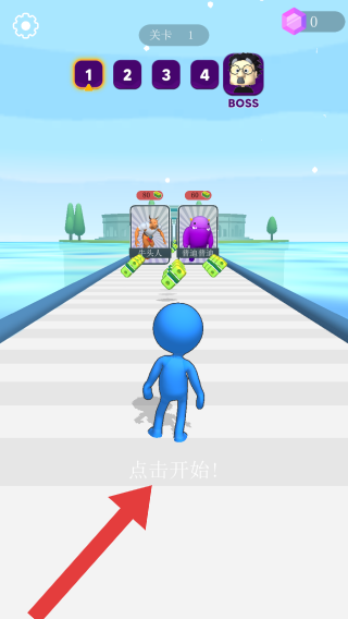 1、呈现“关卡1”“点击开始!”等信息,有角色、敌人(如“尖头人”“毒液怪”)、BOSS等元素,属于常见的跑酷或战斗闯关开局场景。