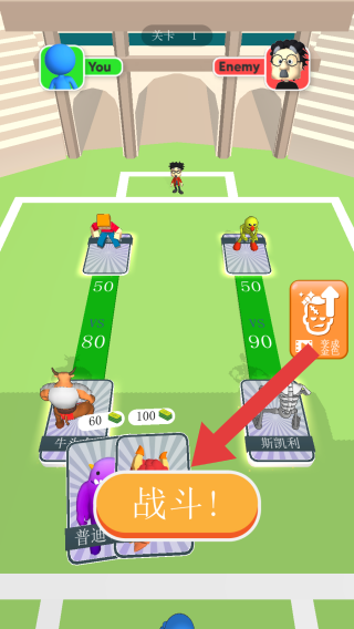 3、呈现“关卡1”“战斗!”按钮,有己方、敌方角色卡牌及属性数值,属于常见的休闲对战场景。