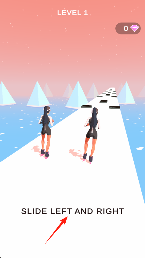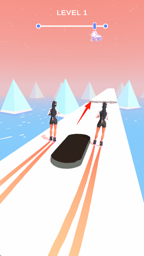 1、操作规则在“LEVEL1”,通过“SLIDELEFTANDRIGHT”(左右滑动),控制两名轮滑角色,避开道路障碍(黑色板块、链条),沿白色跑道前进。