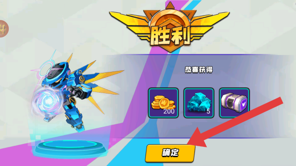 3、呈现“胜利”标题、获得奖励(200金币、5蓝色晶体、1装备等)、【确定】按钮等实体信息,可识别出胜利奖励等内容。