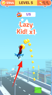 2、操作目标收集金币(黄色),达成“8/15”“2/11”“1/5”任务进度,触发“LazyKid!x1”等效果,提升分数与等级。