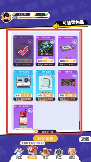 2、拆箱过程以随机为核心,不同品质的箱体产出不同等级的物品,你需要从中筛选可供售卖或收藏的优质道具。