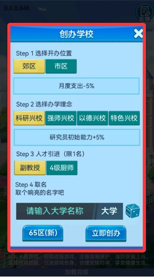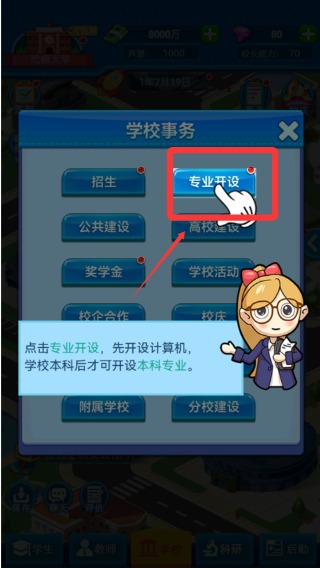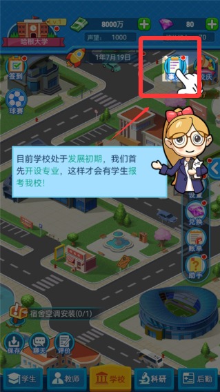 1、经营环节从基础设施建设入手,合理分配资源建立教学楼、食堂、图书馆等区域,并逐步提升建筑等级改善使用体验。
