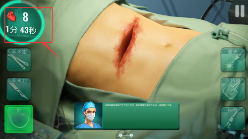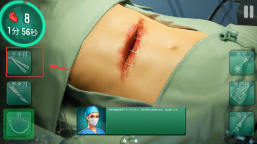 2、在手术模拟环节选取相应医疗器械,按照提示步骤完成伤口清理与缝合操作。