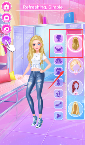2、在装扮界面自由选择发型、服饰与配饰进行搭配,通过滑动屏幕查看不同角度的着装效果。