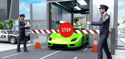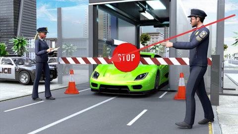 1、在交通检查场景,配合同事拦截车辆(如绿色超跑),按流程检查证件、排查隐患,完成执勤任务。