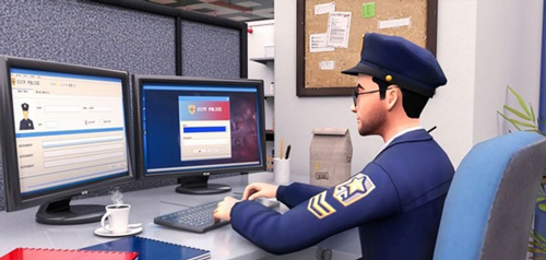 3、在办公场景,操作电脑处理警务(如录入信息、查看案件),利用办公设备(文件、咖啡)维持工作状态。
