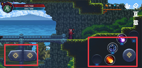 1、进入游戏后,利用左下角左右按钮操控角色的移动,右边向上按钮为跳跃,其他按钮分别为角色的技能。