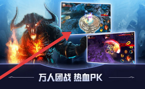 2、参与“万人团战热血PK”,关注箭头指向的团战场景,跟随大部队,利用职业技能(如右侧角色远程攻击),争夺团战胜利。