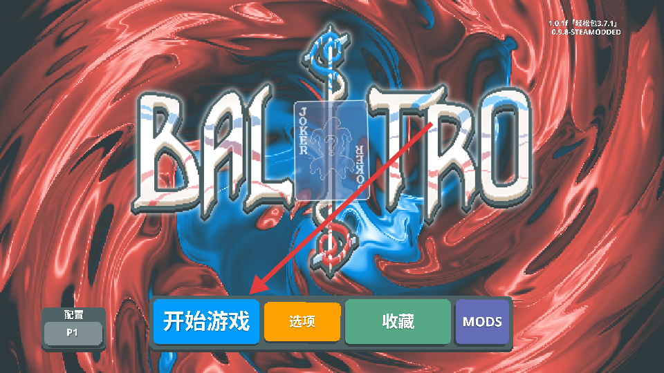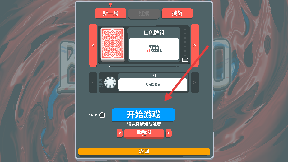 1、先选个牌组,幽灵牌组开局就送妖法牌,但会炸掉其他小丑,适合喜欢赌命的狠人。