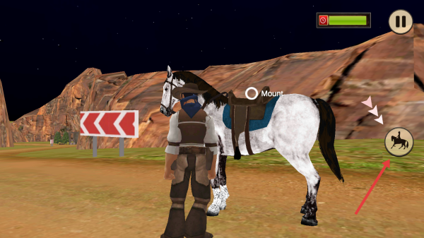 2、在野外靠近马匹,点“Mount”图标上马,掌握骑马基本操作,准备沿路线探索。