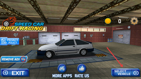 1、在车库点【SELECT VEHICLE】,选初始赛车,了解车辆漂移、加速性能,为比赛做准备。