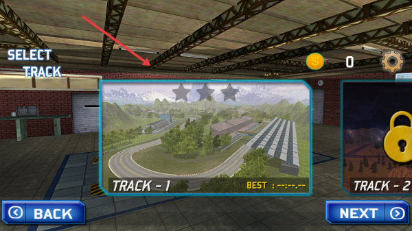 2、进入赛道选择,选“TRACK-1”,熟悉该赛道弯道、地形,规划漂移路线,争取好成绩。