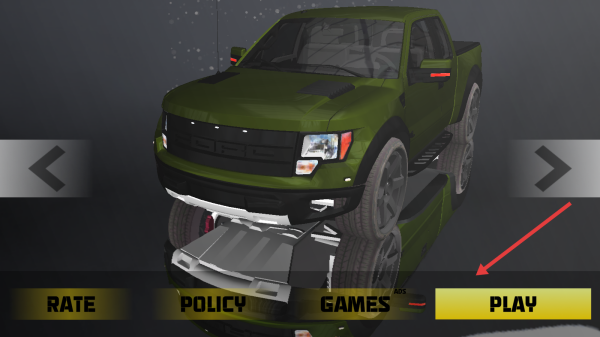 1、在车辆选择界面点【PLAY】,进入城市道路场景,准备驾驶绿色皮卡车开启挑战。