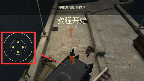 1、进入游戏后会有一段新手教程,滑动左侧摇杆移动角色。